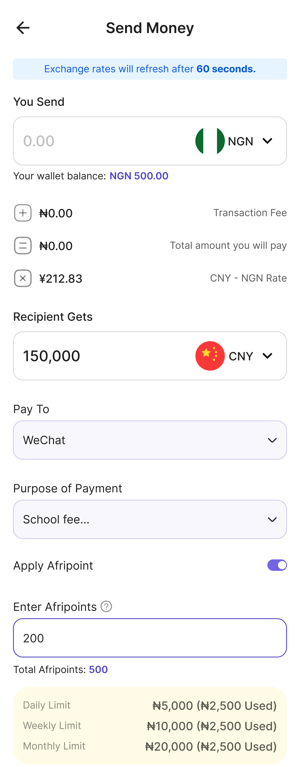 When sending money from Nigeria to China with AfriChange, you can send via your NGN funded wallet or with WeChat Pay.