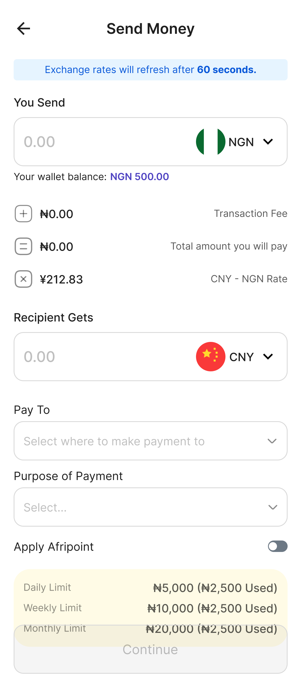 This is where you start the process of sending money from Nigeria to China. Select the ‘Send Money’ button on your dashboard.