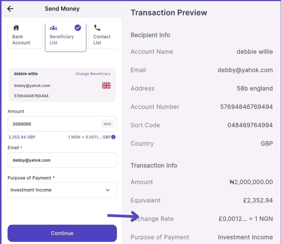 - Go ahead and input the naira amount you want to send and the purpose of payment. Once done, the rate converter will automatically display the GBP equivalent your recipient will receive.