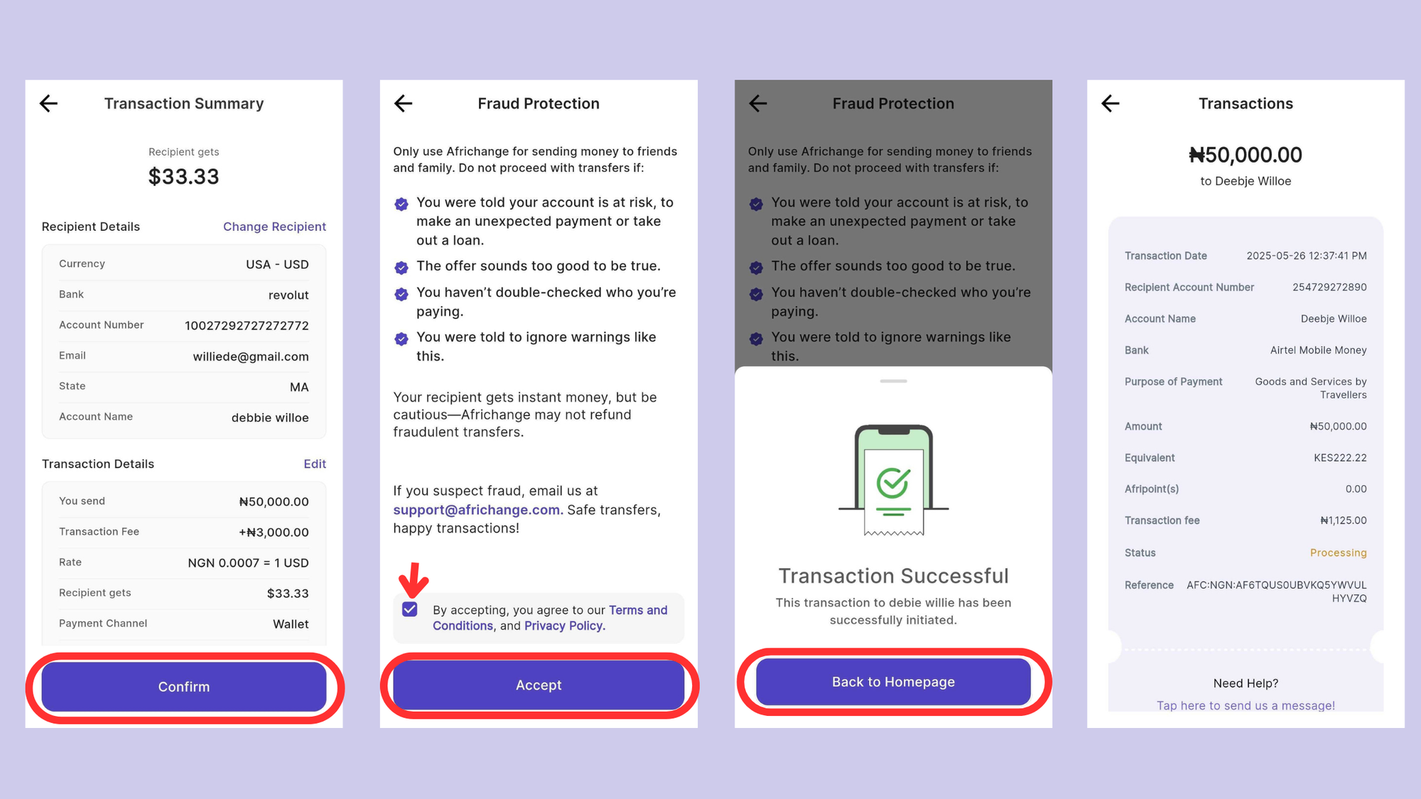 - Carefully review your transaction summary, including the amount, exchange rate, and recipient info.