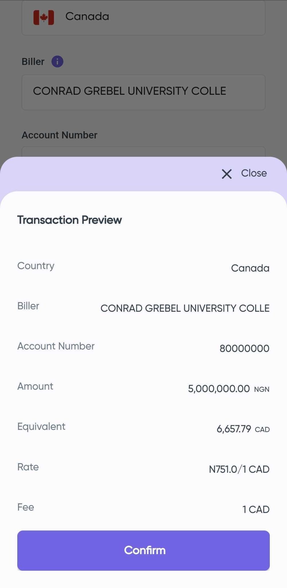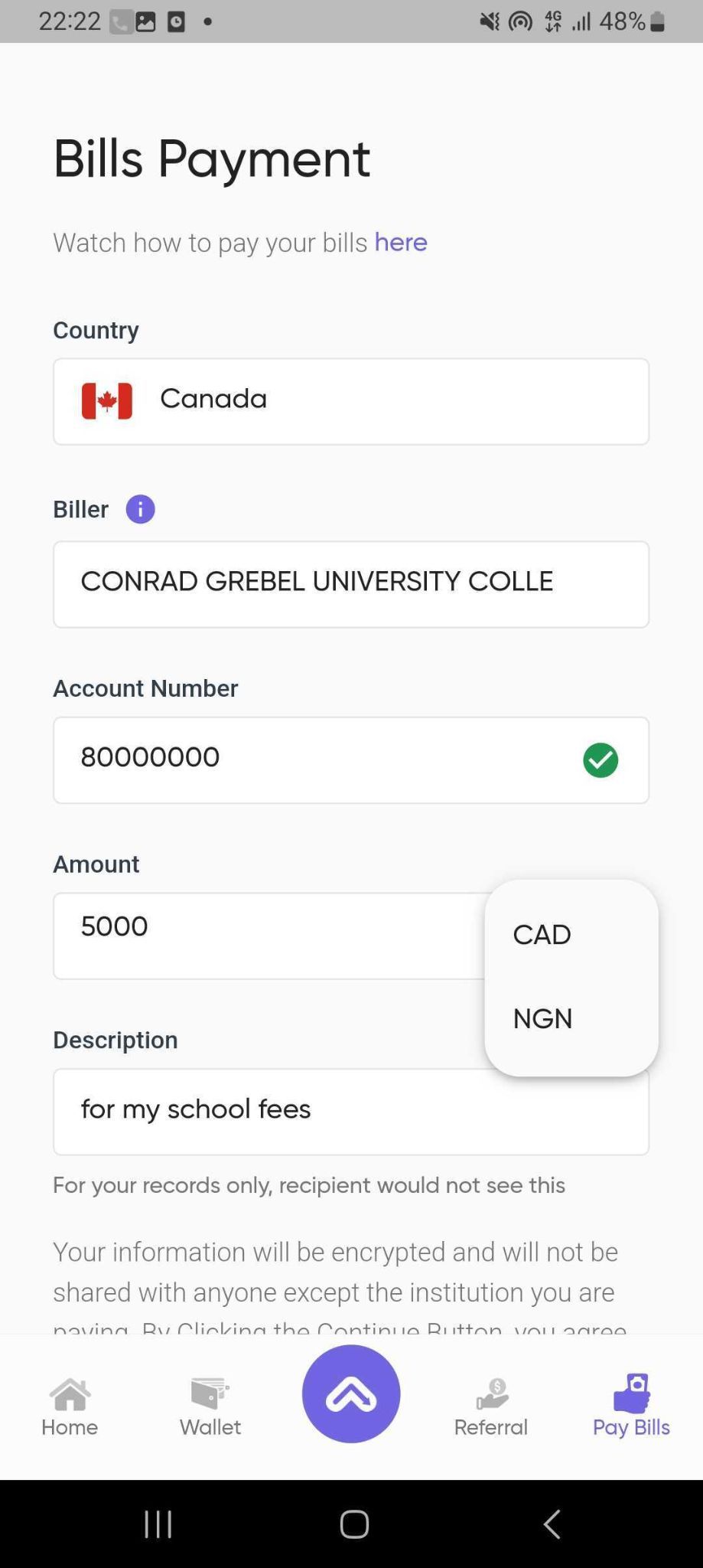 5. Carefully input the biller’s details starting with Canada as country. You can either send from your naira wallet or cad wallet.