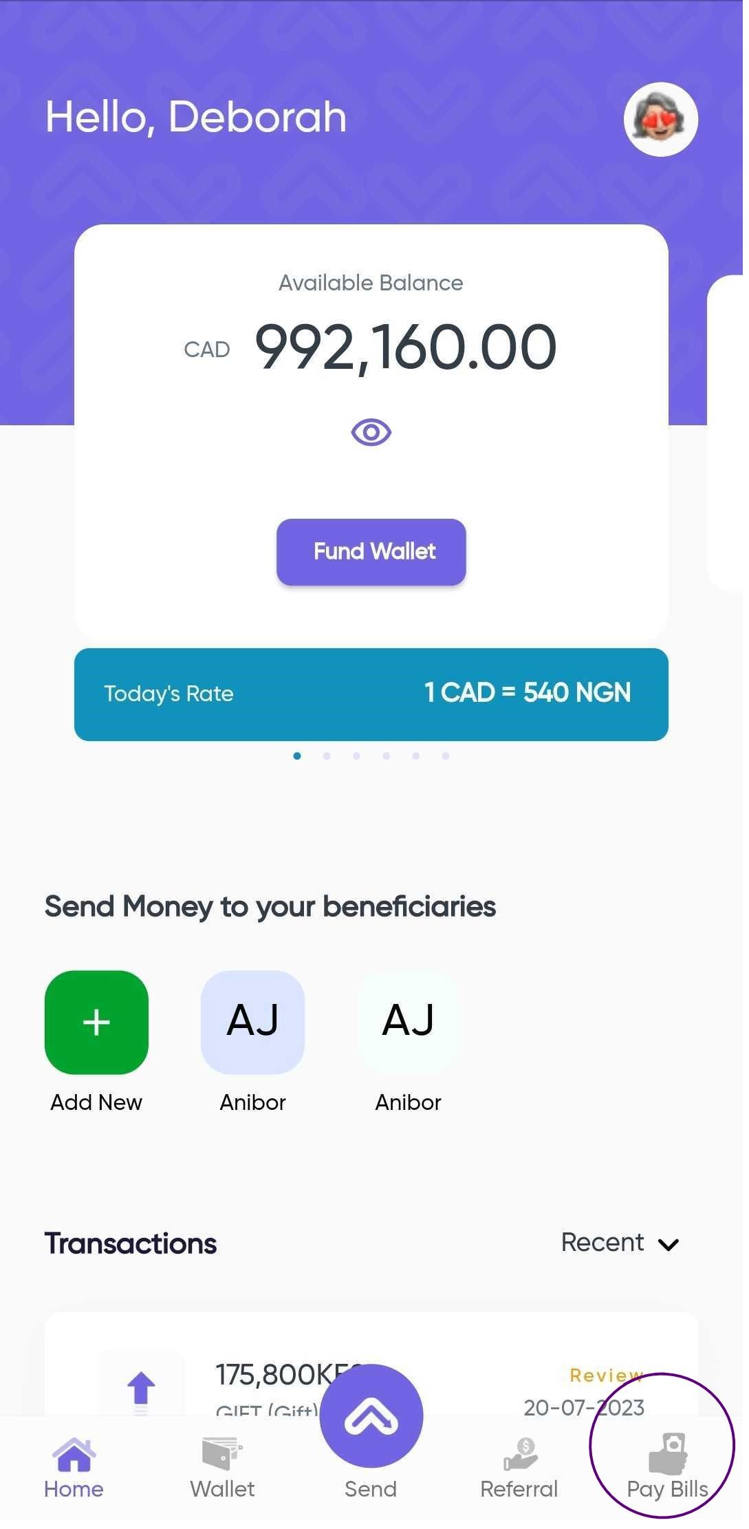 4. Upon funding your wallet. On the home page, select the ‘Pay bills’ icon.